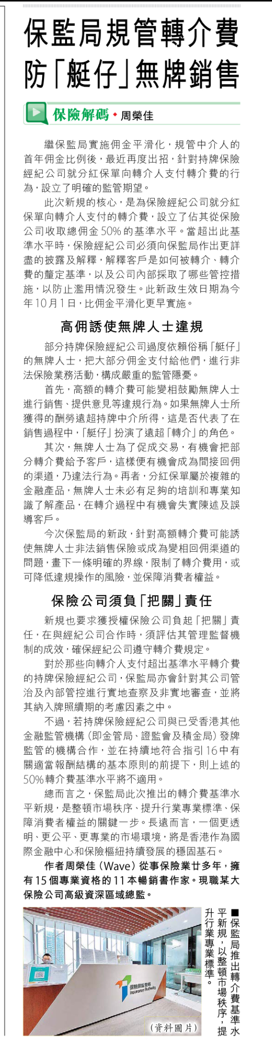 <信報> 保監局規管轉介費 防「艇仔」無牌銷售